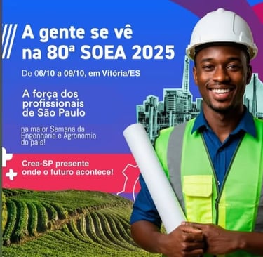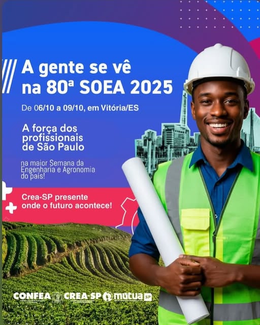 Depois do sucesso da última edição, na Bahia, faltam poucos dias para a 80ª Semana Oficial da Engenharia e da Agronomia (SOEA), que neste ano acontece em Vitória/ES! O Crea-SP tem orgulho de marcar presença, ano após ano, no maior encontro nacional da área tecnológica. Nossa participação já é tradição: em cada edição, nossos profissionais representam a força e a diversidade da Engenharia, Agronomia, Geociências, Tecnologia e Design de Interiores em diálogo com todos os estados do país. Será histórico. Nos vemos na SOEA 2025!
