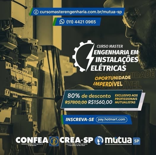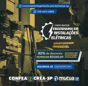 A Mútua-SP, em parceria com o Potência Educação, oferecem a oportunidade imperdível, com o desconto exclusivo, 80%, por R$ 1.560,00 somente para MUTUALISTAS, o Curso Master em Engenharia em Instalações Elétricas, com profissionais do mais alto nível. Um CURSO ONLINE, de extensão universitária, porém similar a uma Pós Graduação, livre para todos os profissionais da área elétrica. Inscrições: https://www.cursomasterengenharia.com.br/mutua-sp/ Informações: (11) 4421 0965