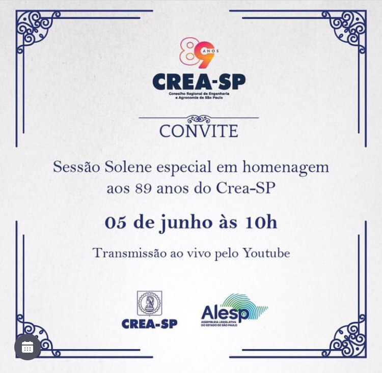 Estamos comemorando 89 anos do Crea-SP e você é nosso convidado especial! 🎈🎉 🎥 Assista à Sessão Solene em homenagem a esta importante data, que será realizada no dia 05 de junho às 10h na Alesp, proposta pelo deputado estadual Ricardo Madalena. 🔴 Que tal acompanhar ao vivo pelo nosso canal do YouTube e celebrar junto conosco este momento marcante? 🌟
