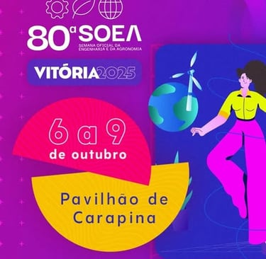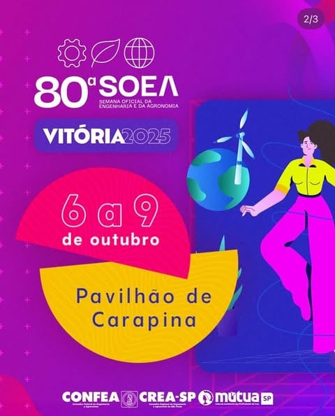 Serão quatro dias intensos de troca de conhecimento, networking e desenvolvimento nas áreas da engenharia, agronomia e geociências. Não perca a oportunidade de participar de um dos maiores eventos do setor no país. Já marca aí na agenda ⤵️ 80ª SOEA 📆 Data: 6 a 9 de outubro 📍 Local: Pavilhão de Carapina – Vitória (ES) 🕒 Horário: Programação completa em breve 📝 Inscrições: disponíveis no site oficial do evento! (link na bio @creasaopaulo ).