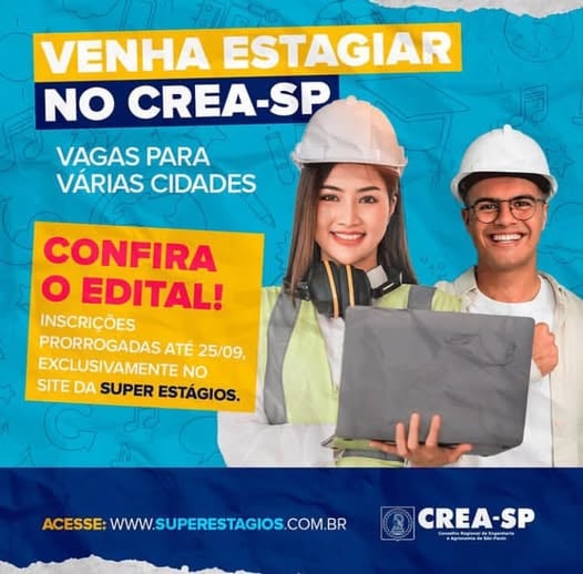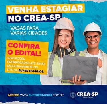 📢 Novidade: Edital PRORROGADO! As inscrições para o processo seletivo de estágio remunerado do Crea-SP foram prorrogadas até o dia 25/09/2023! 🚀 Não perca essa chance de impulsionar sua carreira. Confira o edital e inscreva-se agora no site da SUPER ESTÁGIOS