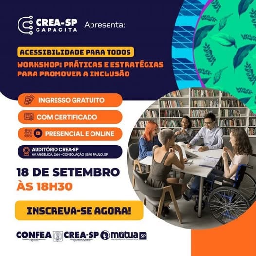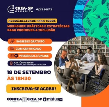 No dia 18/09, às 18h30, o Crea-SP convida a todos para o Workshop Práticas e Estratégias para Promover a Inclusão. O evento trará especialistas para debater a inclusão de pessoas com deficiência no ambiente profissional e a implementação de políticas públicas de acessibilidade.